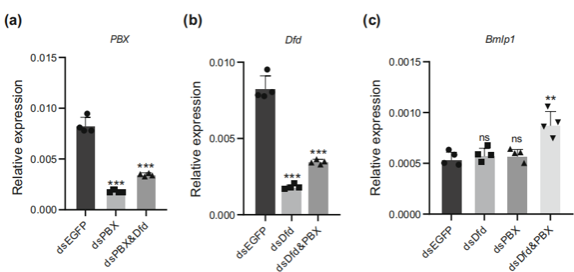 (a-c)通过RT-qPCR技术检测BmN细胞中过表达PBX和Dfd后,PBX、Dfd及BmLP1的表达水平