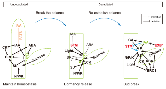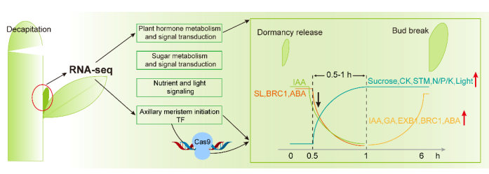 腋芽是决定植物分枝形成与地上部分形态建成的关键器官,对作物的生长和生产力有着至关重要的影响。探析腋芽从休眠到萌发的分子机制,是植物生长调控研究中的核心科学问题之一。尽管现有研究揭示了腋芽在休眠解除后的发育过程,但触发休眠解除信号的早期调控网络仍不清晰。本研究以烟草(Nicotiana tabacum)为研究对象,聚焦打顶后36小时内腋芽发育调控因子的转录组变化,系统解析了诱导休眠解除的关键分子事件。结果显示,生长素(IAA)、细胞分裂素(CK)、赤霉素(GA)、脱落酸(ABA)和独脚金内酯(SL)等多种植物激素,以及糖(Sucrose)、氮(N)、磷(P)、钾(K)和光照(Light)等营养与环境信号均参与了打顶诱导的腋芽休眠解除过程,且在打顶后0.5至1小时即发生显著变化。其中,生长素和糖信号在触发休眠解除程序中起着核心作用。此外,在腋芽激活后的继续发育阶段,各种信号因子亦表现出协同调控效应。