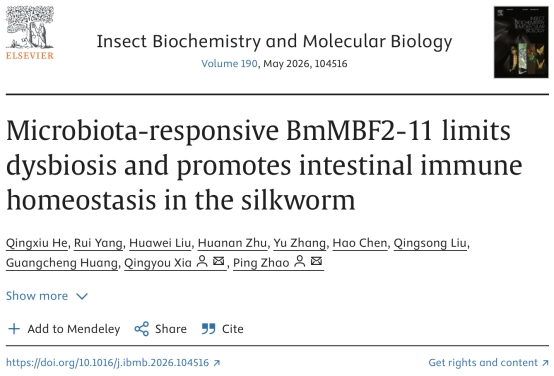 2026年2月13日,西南大学赵萍教授、夏庆友教授团队在国际期刊《Insect Biochemistry and Molecular Biology》在线发表题为“Microbiota-responsive BmMBF2-11 limits dysbiosis and promotes intestinal immune homeostasis in the silkworm”的研究论文。该研究首次鉴定出家蚕中肠高表达的微生物响应因子 BmMBF2-11,揭示其在响应肠道微生物扰动、限制肠道菌群失衡、促进抗菌肽表达以及增强宿主肠道抗菌防御中的重要作用,为解析鳞翅目昆虫肠道微生态调控机制及改良人工饲料养蚕健康管理提供了新的分子靶点。