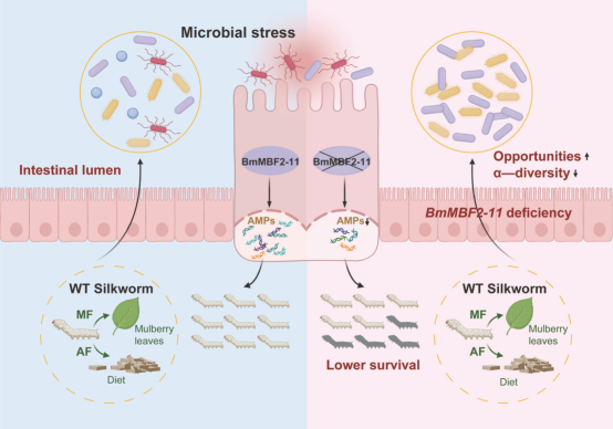MBF2家族蛋白此前多被认为与转录共激活相关,而本研究首次将其直接与家蚕肠道菌群稳态调控和抗菌免疫应答联系起来,拓展了该家族蛋白的功能认知。总体而言,该研究表明,BmMBF2-11是家蚕维持肠道菌群平衡的重要宿主因子,在不同饲养条件下可通过促进抗菌肽表达、限制条件致病菌扩张来维持肠道健康。该成果不仅深化了对鳞翅目昆虫肠道微生态调控机制的理解,也为人工饲料配方优化、益生菌干预和抗病品系选育提供了理论依据与潜在分子靶标。
