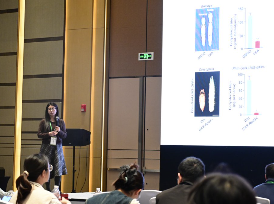 本次会议设立了针对青年教师、博士后和博士生的专题分会场,共有两个分会场,安排了41场专题报告,报告内容涵盖昆虫进化、发育、系统发育、免疫、生殖、化学生态等多个研究方向。中心袁冬琴博士后作了题为“昆虫蜕皮激素合成和变态发育的表观遗传调控机制”的报告。