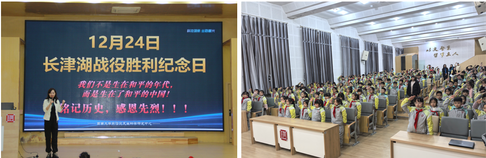 特别令人动容的是,12月24日这堂课的尾声,陈老师将时间的指针拨向了一段不能忘却的历史:她向孩子们讲述了长津湖战役胜利纪念日的意义,讲述了先烈们用热血与生命守护家国的壮烈篇章。在肃穆的氛围中,全体学生起立,向先烈们敬上庄严的少先队队礼。这一刻,科学的探索与精神的传承产生了深深的共鸣——不仅让孩子们懂得了创新求索的价值,更让他们铭记幸福生活的来之不易。这堂科普课,因此升华为一场深刻的爱国教育洗礼。