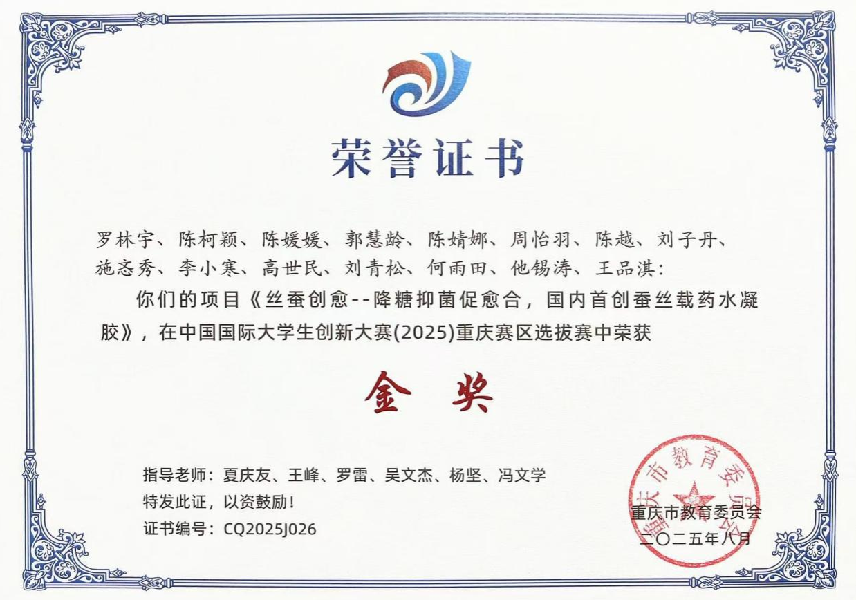 近日,由西南大学前沿交叉学科研究院生物学研究中心夏庆友教授、王峰研究员,以及西南大学药学院中医药学院罗雷教授联合指导本科生完成的科技创新项目《丝蚕创愈——降糖抑菌促愈合,国内首创蚕丝载药水凝胶》,在中国国际大学生创新大赛(2025)重庆赛区选拔赛中荣获金奖。获奖学生是:罗林宇、陈柯颖、陈媛媛、郭慧龄、陈婧娜、周怡羽、陈越、刘子丹、施忞秀、李小寒、高世民、刘青松、何雨田、他锡涛、王品淇。