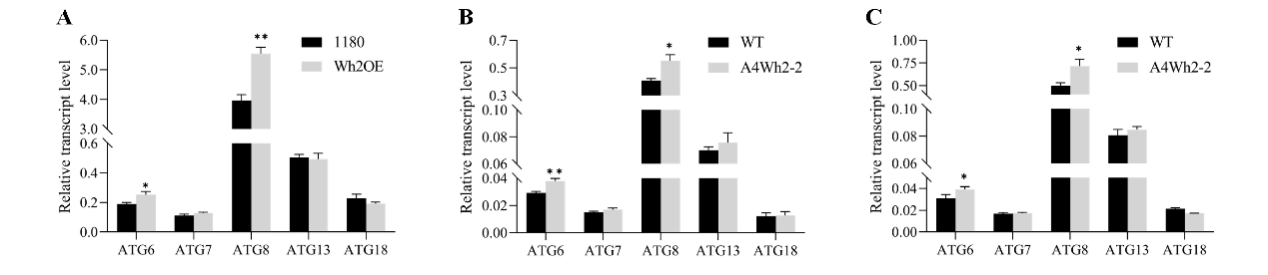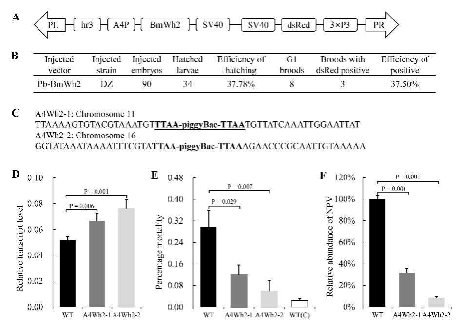 ABC转运蛋白广泛分布于各种生物体内,在多种生物学过程中发挥重要作用,但它们在“昆虫—病毒”互作中的角色鲜有报道。本研究发现家蚕ABC转运蛋白BmWh2被BmNPV诱导上调表达,在BmE细胞中增量表达BmWh2可以显著抑制病毒增殖,而敲除BmWh2促进了病毒增殖。制备了增量表达BmWh2的转基因家蚕,其对BmNPV的抗性显著增强。在增量表达BmWh2的BmE细胞和转基因家蚕中,ATG6和ATG8的mRNA水平显著增加,暗示BmWh2通过上调ATG来抑制病毒增殖。