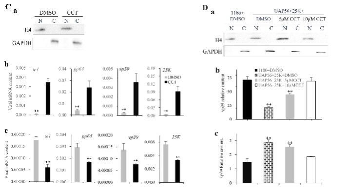 本研究发现CCT018159 靶向UAP56抑制 BmNPV增殖,并在病毒晚期基因表达阶段发挥作用。通过蛋白表达、Pull-down、质谱鉴定,筛选到与UAP56结合的候选病毒蛋白,利用Co-IP、Pull-down等体内、体外结合实验,证明BmNPV的晚期病毒蛋白 25K 与 UAP56 直接结合。进一步研究发现,CCT018159不影响25K与UAP56的共定位,但阻断了二者之间的结合,导致病毒mRNA在细胞核中异常积累。增量表达25K和UAP56导致细胞质中的病毒mRNA含量增加而细胞核中的含量降低,添加CCT018159可以逆转这一趋势。