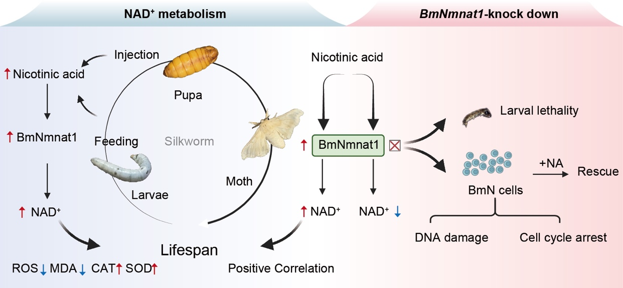 NAD⁺是调控能量代谢、DNA修复与细胞稳态的关键分子,在哺乳动物衰老研究中备受关注。然而,其在昆虫等无脊椎动物中的功能机制仍缺乏系统解析。本研究通过对多个家蚕品系进行寿命比较,发现长寿品系体内NAD⁺水平显著更高,同时NAD⁺合成关键酶基因BmNmnat1表达上调,提示NAD⁺代谢活性与寿命呈正相关。通过CRISPR/Cas9基因敲除与RNA干扰实验,研究团队发现BmNmnat1缺失会导致胚胎致死、DNA损伤累积、细胞周期阻滞以及衰老样形态改变,表明其在维持基因组稳定和细胞增殖方面具有核心作用。进一步研究显示,补充NAD⁺前体烟酸(NA)能够显著提高体内NAD⁺水平,降低氧化应激,激活Sirtuin、AMPK、FoxO等长寿相关通路,并显著延长家蚕成虫寿命,其中雌性个体延寿效果尤为显著。