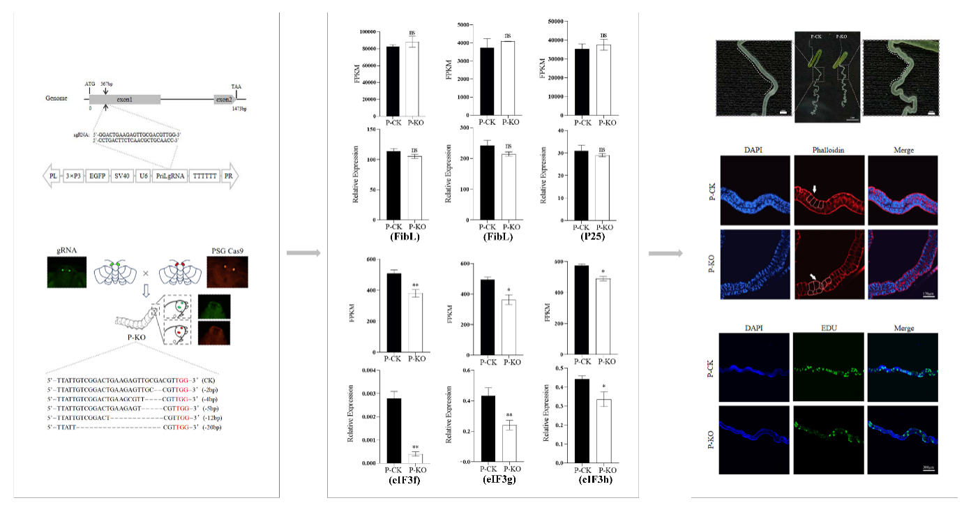该研究首先制备了Ser1P介导BmPriL在中部丝腺特异表达、FibHP介导BmPriL在后部丝腺特异表达的转基因家蚕品系,通过丝腺的表型观察及测量、鬼笔环肽染色及细胞面积统计、EdU染色及总DNA含量检测、经济性状调查,发现增量表达BmPriL促进了丝腺的发育并提升了蚕丝产量。然后,通过基因编辑分别在家蚕中部丝腺、后部丝腺特异敲除BmPriL,发现丝腺发育受到抑制且蚕丝产量显著降低。最后,通过转录组分析和qPCR验证,发现敲除BmPriL不影响丝蛋白基因的转录,但显著下调了真核翻译起始因子 3(eIF3)的 H、F 和 G 亚基的表达。这些结果说明,敲除 BmPriL 基因导致 eIF3表达量降低,从而抑制了丝蛋白的合成、减少了蚕丝的产量。该研究加深了我们对丝蛋白合成和丝腺发育分子机制的理解,为培育高产家蚕品种提供了潜在的靶标基因。