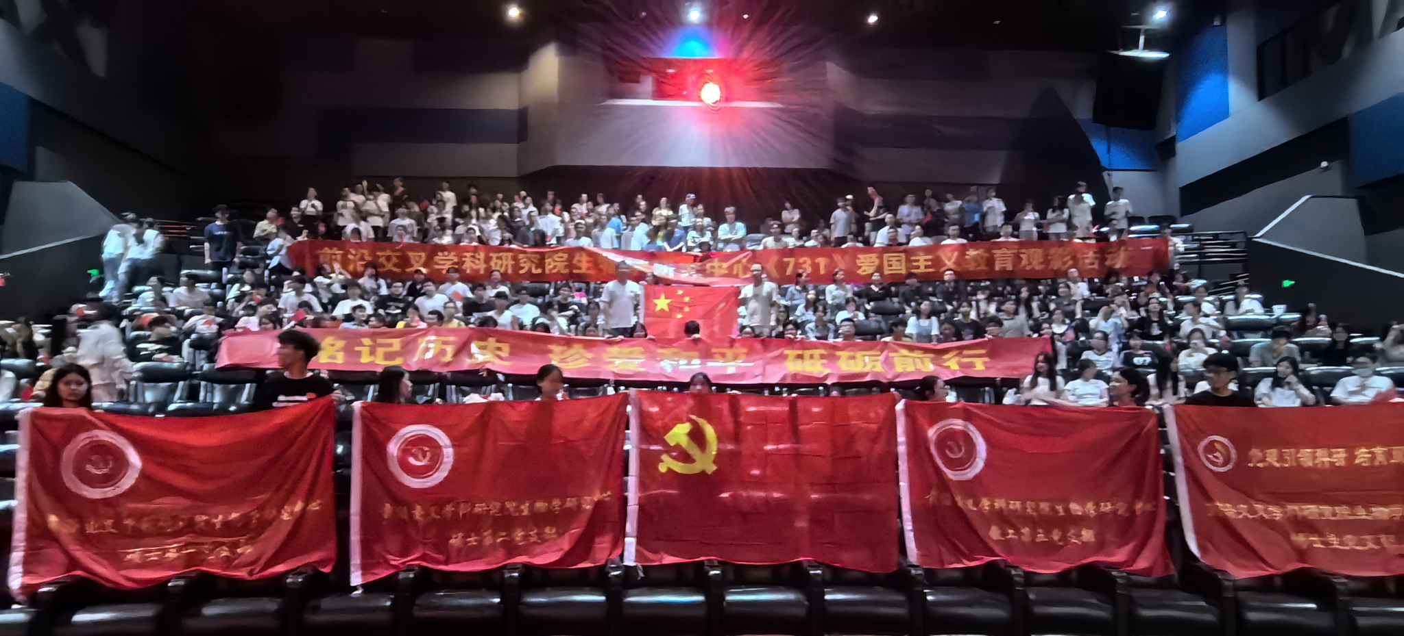 观影结束后,全体师生在影厅内举行宣誓仪式。各党支部高举党旗,现场悬挂“铭记历史,珍爱和平,砥砺前行”横幅,全体师生齐声高呼:“铭记历史,珍爱和平,生物学研究中心师生砥砺前行!”誓言铿锵,久久回响,传递出师生以史为鉴、奋发进取的坚定信念。