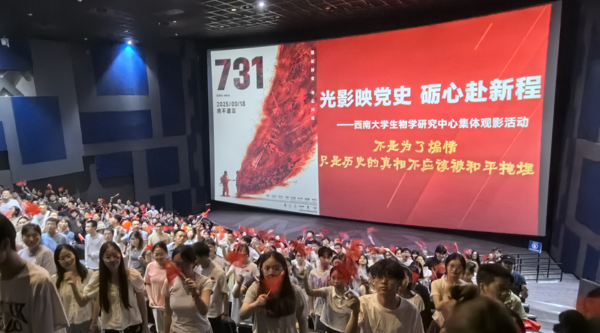 2025年9月18日,西南大学生物学前沿交叉学科研究院生物学研究中心组织300余名师生前往北碚万达影院,集体观看爱国主义题材电影《731》,以观影为契机开展主题教育,强化历史记忆,激发使命担当。