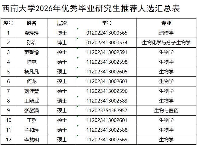 按照《关于开展西南大学2026年优秀毕业生评选工作的通知》《关于开展西南大学2026年优秀毕业研究生评选工作的通知》,经学生自主申请、学生工作组审查、中心党政联席会审核通过,拟推荐名单如下: